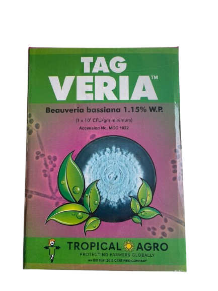 Tag Veria is a broad-spectrum biopesticide containing an entomopathogenic fungus that has the most virulent strain of Beauveria Bassiana. This Beauveria Bassiana works as a bio insecticide and is effective against various sucking insect pests and chewing insect pests. TAG VERIA has the best IPM tool for resistance management, when the conidia in Tag Veria comes in contact with the insect body, it gets attached to the cuticle of the insect and starts germinating to cause a disease known as white muscadine, which eventually kills the insect by draining its nutrients. It is eco-friendly and is compatible with chemical pesticides, except fungicides. Does not leave any residue in the produce and in the environment. The product has a high spore count (minimum 100 million cfu / gm of product).